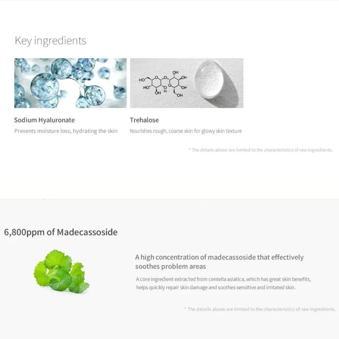 - Madecassoside calms irritation, strengthens the skin, and supports collagen repair for resilience and balance.