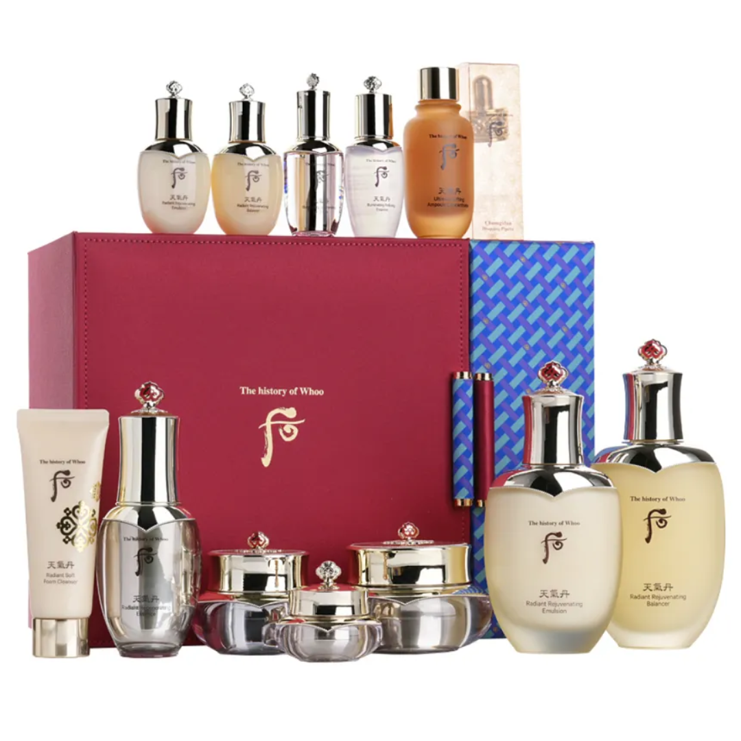 [Cheongidan Radiant Regenerating Essence] Water, Isostearyl Isostearate, Alcohol Denat., Butyrospermum Parkii (Shea) Butter, Dipropylene Glycol, Glycerin, Isononyl Isononanoate, Niacinamide, Squalane, 1,2-Hexanedio, Dimethicone, Ceteareth-6 Olivate, Diglycerin, Panthenol, Cetearyl Alcohol, Hydroxyethylpiperazine Ethane Sulfonic Acid, Sorbitol, Ammonium Acryloyldimethyltaurate/VP Copolymer, Steareth-21, Butylene Glycol, Hydrogenated Olive Oil Unsaponifiables, Fragrance, Polyquaternium-51, Acrylates/C10-30 Alkyl Acrylate Crosspolymer, Tromethamine, Xanthan Gum, Titanium Dioxide (CI 77891), Mica, Trisodium EDTA, Boron Nitride, Pearl Powder, Sodium Hyaluronate, Sodium Pyruvate, Iron Oxide Red, Paeonia Lactiflora Root Extract, Lonicera Japonica (Honeysuckle) Flower Extract, Chrysanthellum Indicum Extract, Dioscorea Japonica Root Extract, Lycium Chinense Fruit Extract, Polygonatum Officinale Rhizome/Root Extract, Cornus Officinalis Fruit Extract, Dimocarpus Longan Fruit Extract, Litchi Chinensis Fruit Extract, Morus Nigra Fruit Extract, Schisandra Chinensis Fruit Extract, Ziziphus Jujuba Fruit Extract, Panax Ginseng Root Extract, Gold, Phellinus Linteus Extract, Punica Granatum Fruit Extract, Angelica Gigas Root Extrac, Ligusticum Sinense Root Extract, Atractylodes Japonica Rhizome Extract, Cnidium Officinale Root Extract, Cuscuta Australis Seed Extract, Cyperus Rotundus Root Extrac, Gardenia Florida Fruit Extract, lycine Soja (Soybean) Germ Extract, Ledebouriella Divaricata Root Extract, Ophiopogon Japonicus Root Extract, Oyster Shell Extract, Paeonia Suffruticosa Root Extract, Poria Cocos Sclerotium Extract, Prunus Armeniaca (Apricot) Kernel Extract, Rehmannia Chinensis Root Extract. Rehmannia Glutinosa Root Extract, Sesamum Indicum Seed Extract, Trichosanthes Kirilowii Root Extract, Mistletoe Extracts, Carthamus Tinctorius (Safflower) Flower Extract, Chrysanthemum Indicum Flower, Nelumbo Nucifera Flower Extrac, Paeonia Officinalis Flower Extract, Ganoderma Lucidum (Mushroom) Extract, Hydrolyzed Conchiolin Protein, Calcium Lactate, Benzyl Benzoate, Hydroxycitronellal, Geraniol, Limonene, Hexyl Cinnama, Citronellol